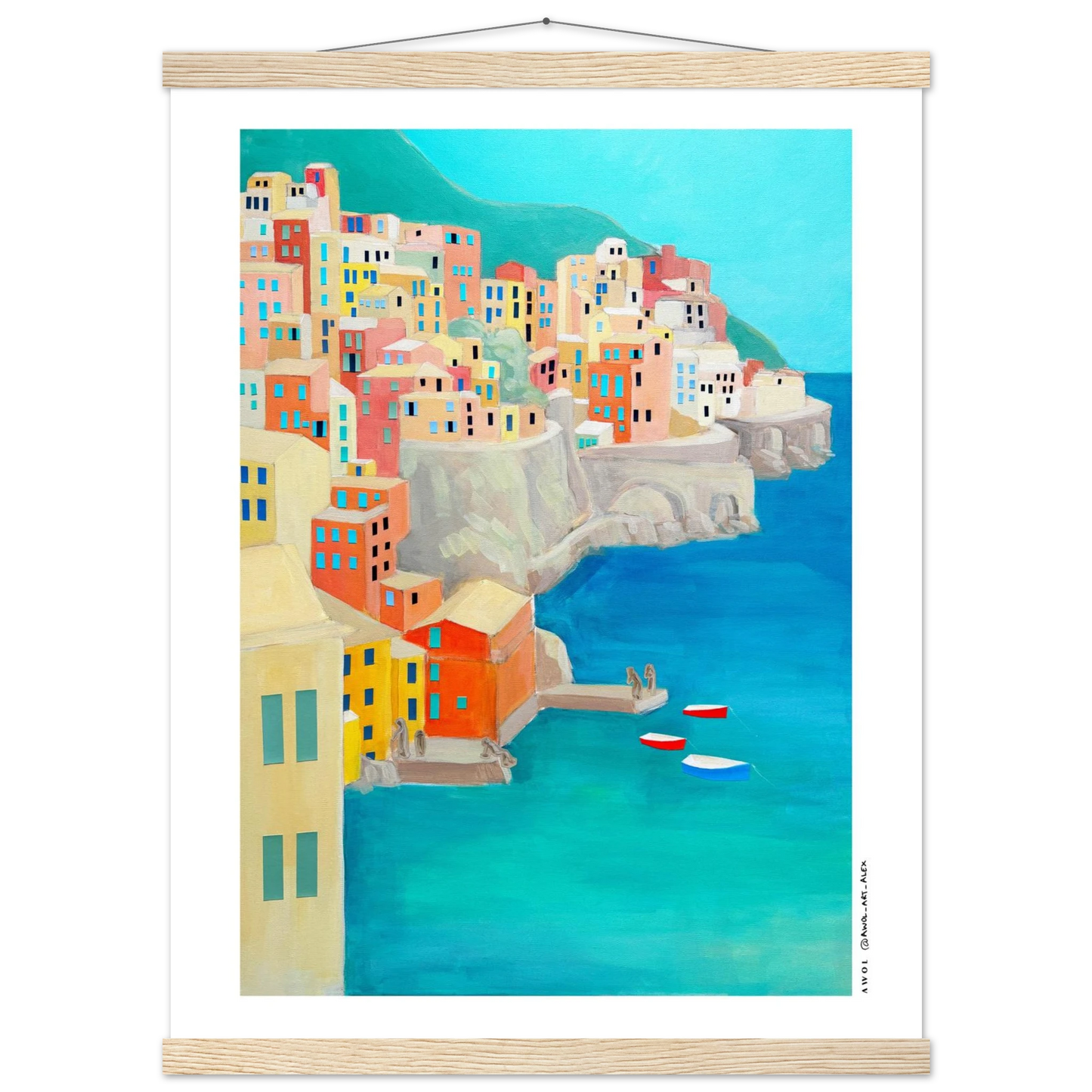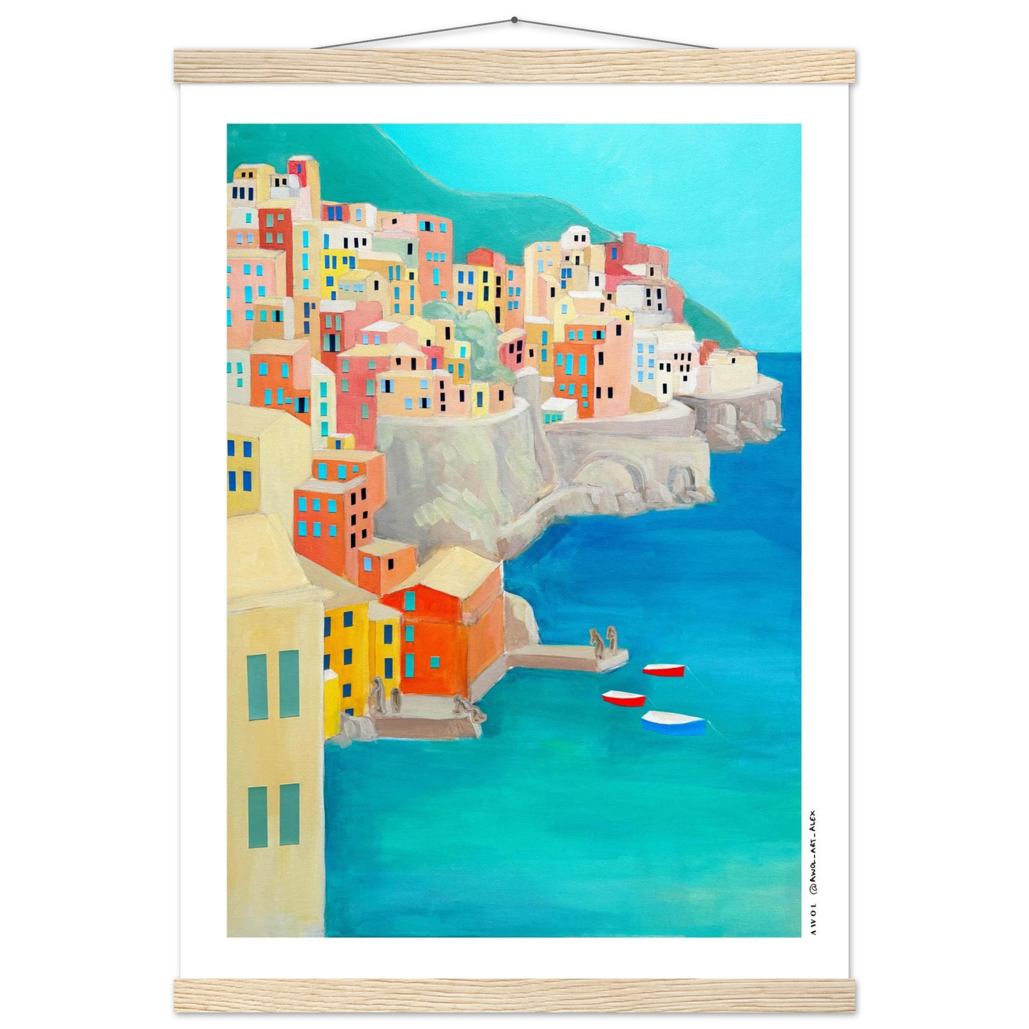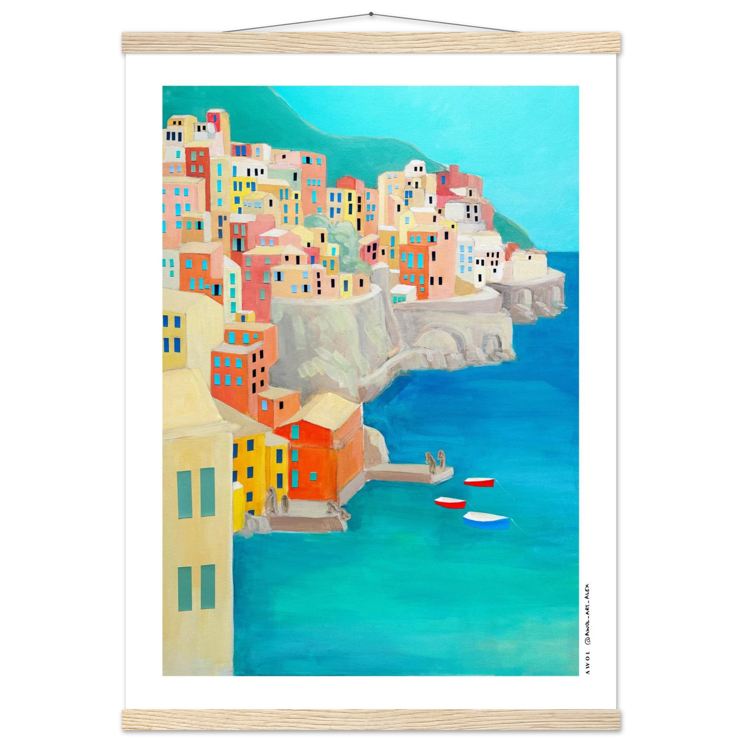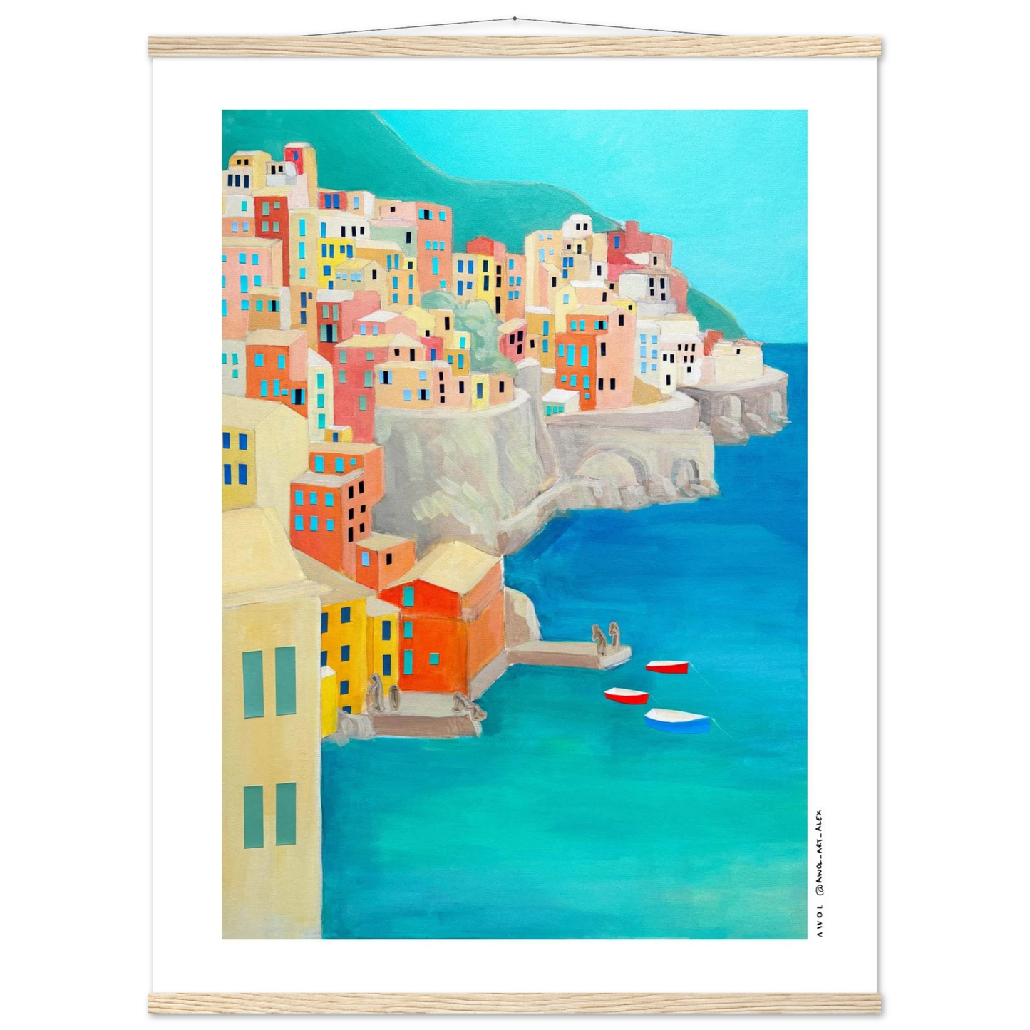 This Italy travel poster with a wooden hanger is inspired by the Amalfi Coast and Liguria's Cinque Terre, originally painted by hand on canvas, and created along many journeys exploring Italy’s iconic Mediterranean coastlines. Colourful fishing villages rise along dramatic seaside cliffs, echoing the colourful landscapes of places like Positano, Portfofino, Manarola, Riomaggiore, and Amalfi town - an artistic re-interpretation, blending together two iconic Italian destinations. The modern art style combines simplified architectural geometric forms with visible painterly texture, creating a balance between contemporary design and traditional hand-painted art on canvas. From a turquoise blue sea rises a collage of earthy pastels, colourful houses, coral, terracotta, sandy beige, soft yellow, and teal tones capture the warmth, light, and rhythm of Italian coastal life, evoking summer, slow travel, and the unmistakable feeling of the dolce vita.