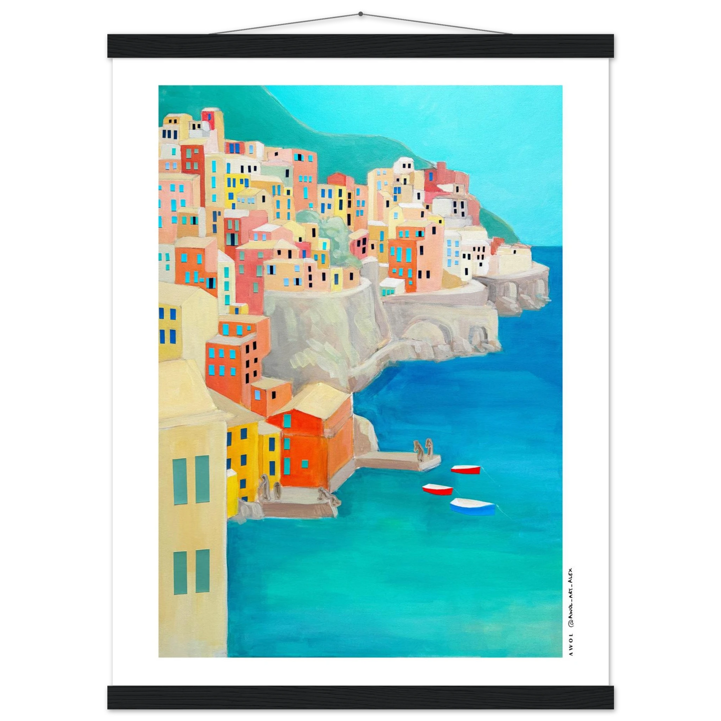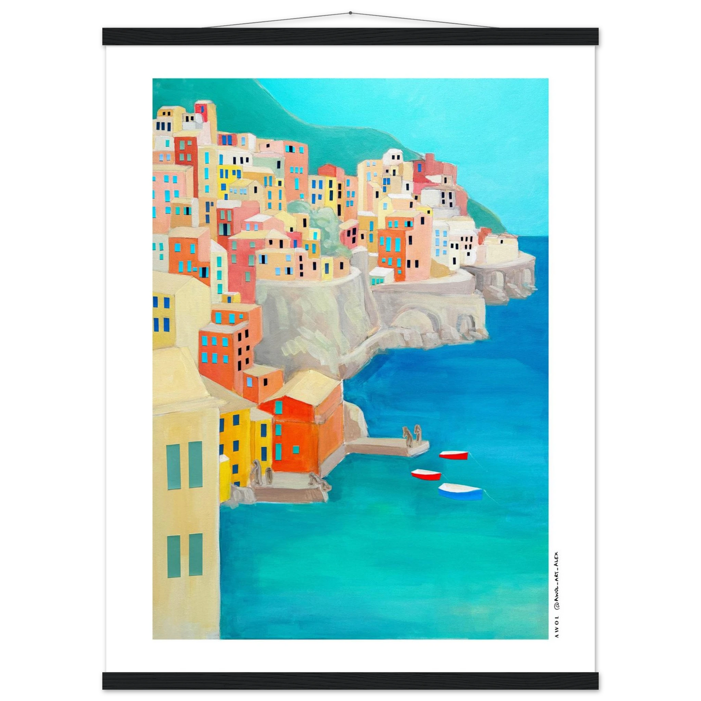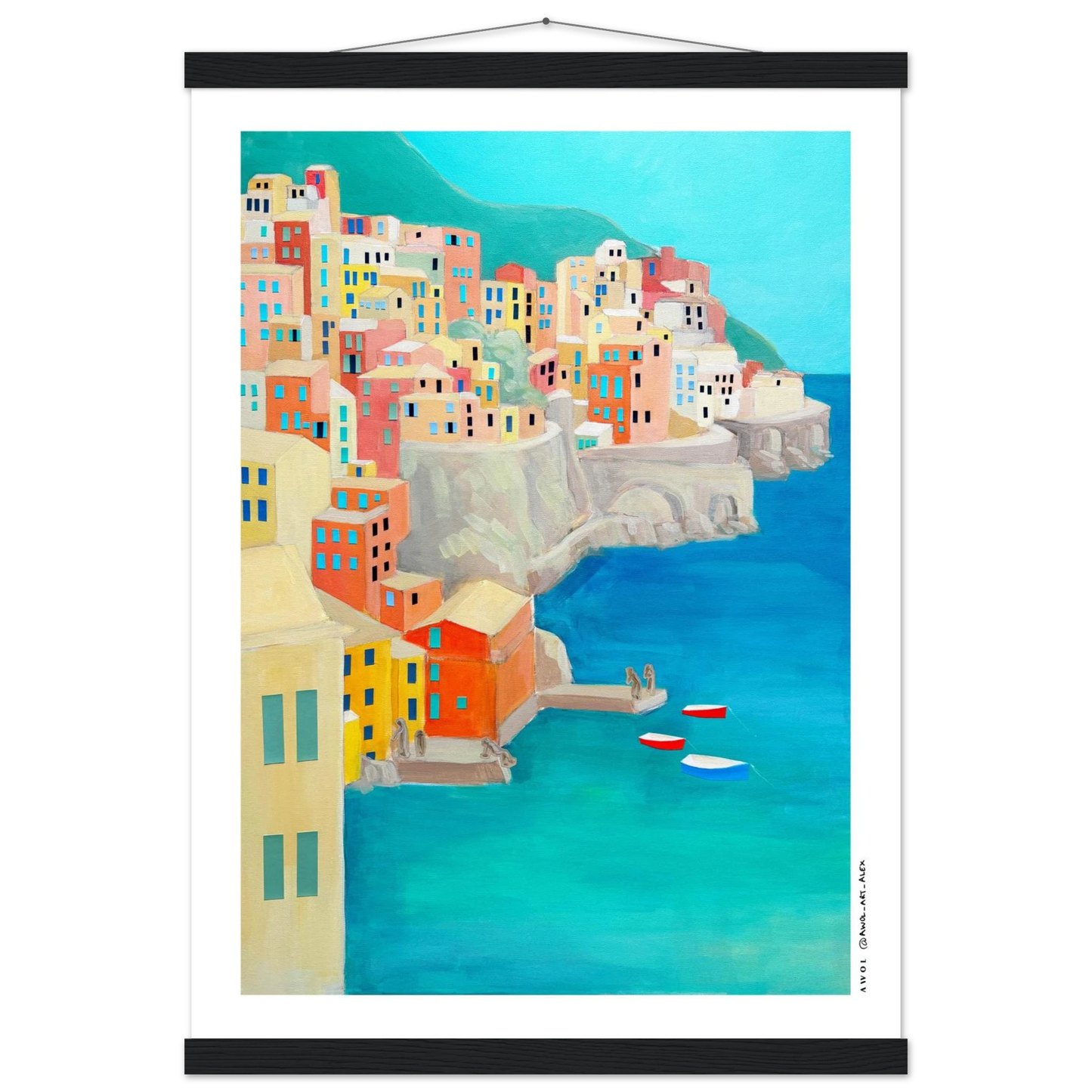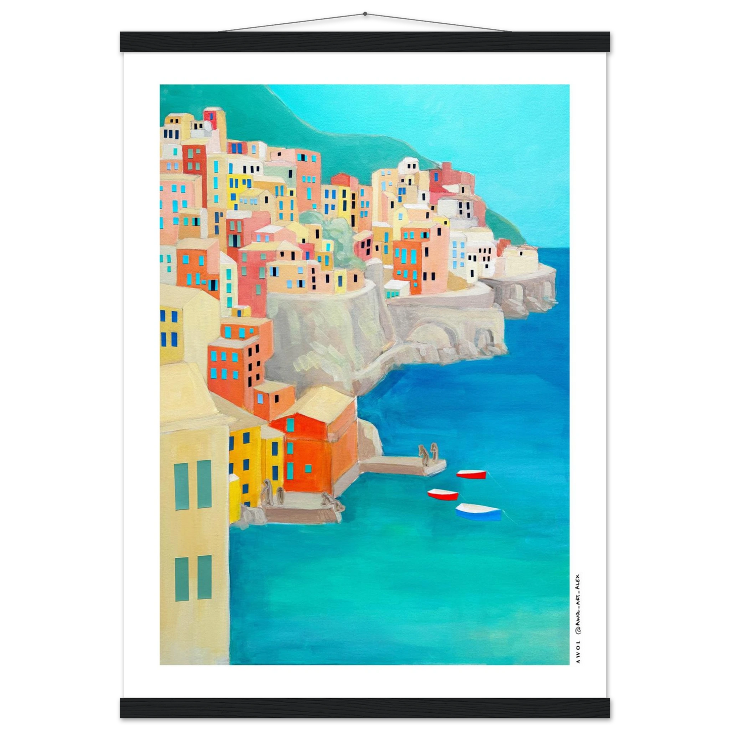 This Italy travel poster with a wooden hanger is inspired by the Amalfi Coast and Liguria's Cinque Terre, originally painted by hand on canvas, and created along many journeys exploring Italy’s iconic Mediterranean coastlines. Colourful fishing villages rise along dramatic seaside cliffs, echoing the colourful landscapes of places like Positano, Portfofino, Manarola, Riomaggiore, and Amalfi town - an artistic re-interpretation, blending together two iconic Italian destinations. The modern art style combines simplified architectural geometric forms with visible painterly texture, creating a balance between contemporary design and traditional hand-painted art on canvas. From a turquoise blue sea rises a collage of earthy pastels, colourful houses, coral, terracotta, sandy beige, soft yellow, and teal tones capture the warmth, light, and rhythm of Italian coastal life, evoking summer, slow travel, and the unmistakable feeling of the dolce vita.