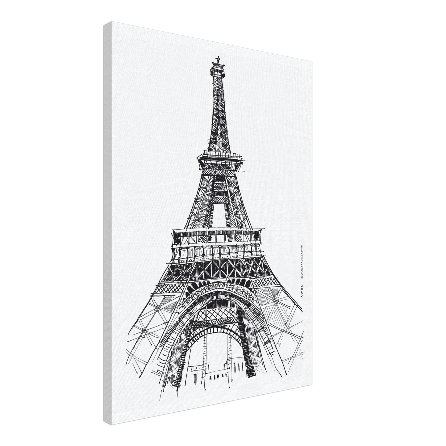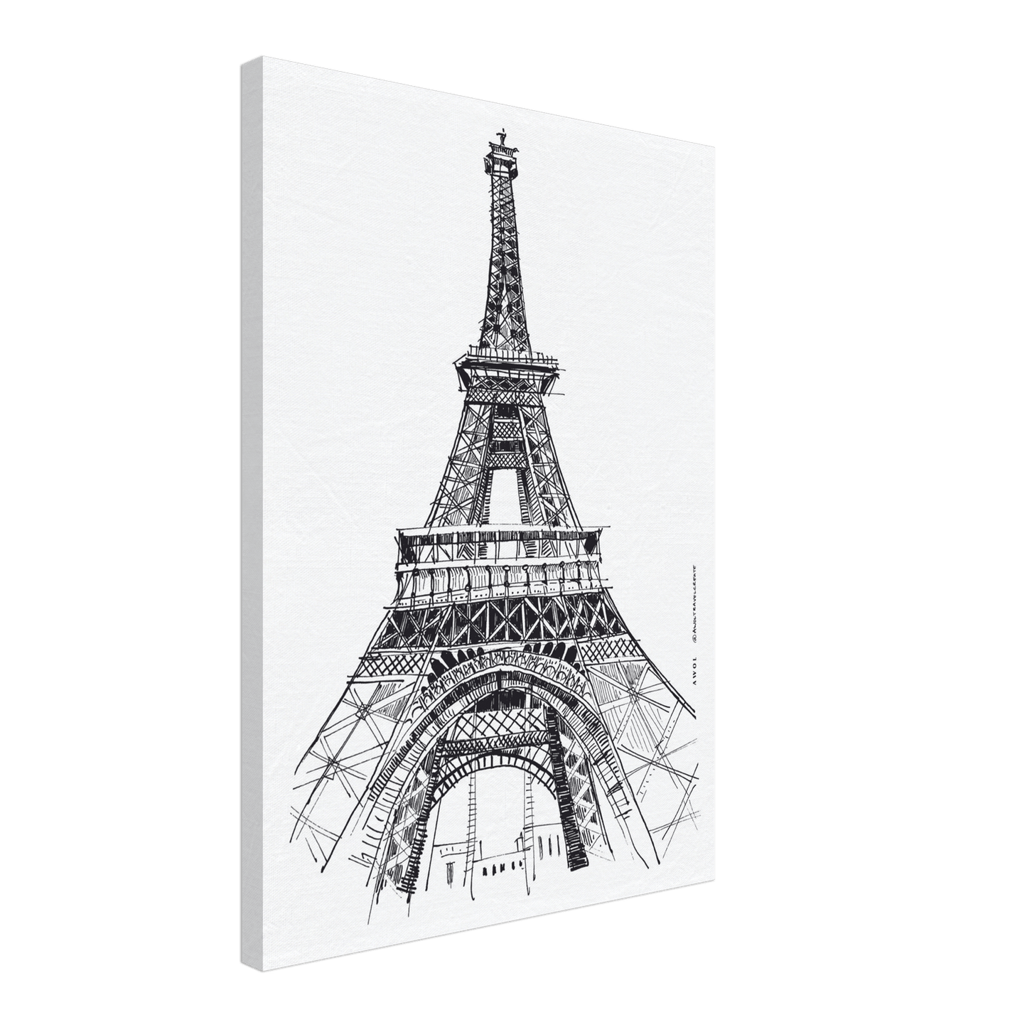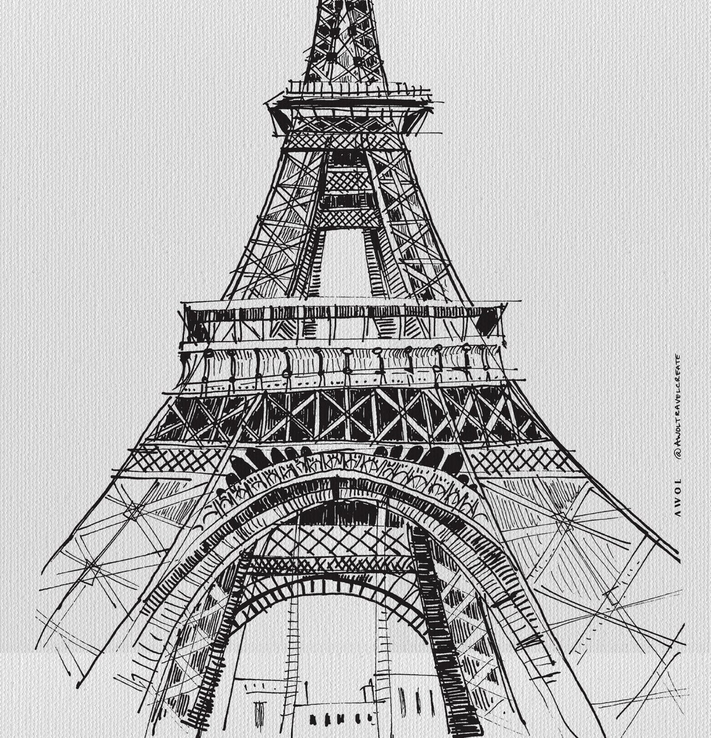 This black and white Paris canvas wall art a city artwork of the iconic Eiffel Tower in Paris, as seen from a truly exaggerated perspective, looking up from the bottom. This monochrome wall art on canvas is a Paris city drawing with detailed sketchy lines offers a unique viewpoint showcasing the iconic architecture and structural details of this Parisian landmark monument.
