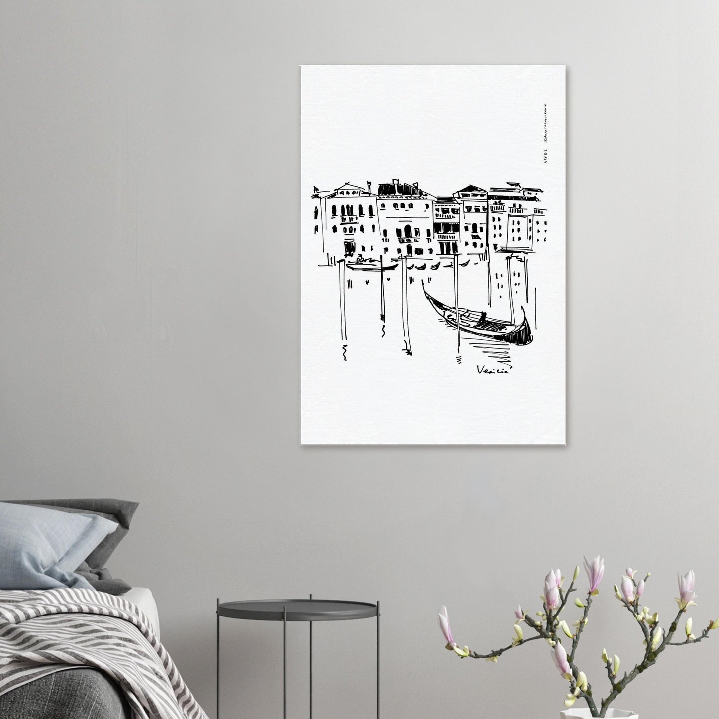 The graphic, dynamic monochrome aluminum art print is a Venice city drawing with strong contrasts and lines, making this modern Venice artwork a cool Italy travel art print, a romantic Italy trip souvenir, an artful Italian keepsake and a cool and thoughtful gift idea for Italy lovers. This Venice travel wall art is like a postcard that you can hang on your wall decor, keeping a beautiful and elegant Venice memory close by to remember your Venice trip and your Italian vacations, making you smile every day and savouring a sense of la dolce vita.
