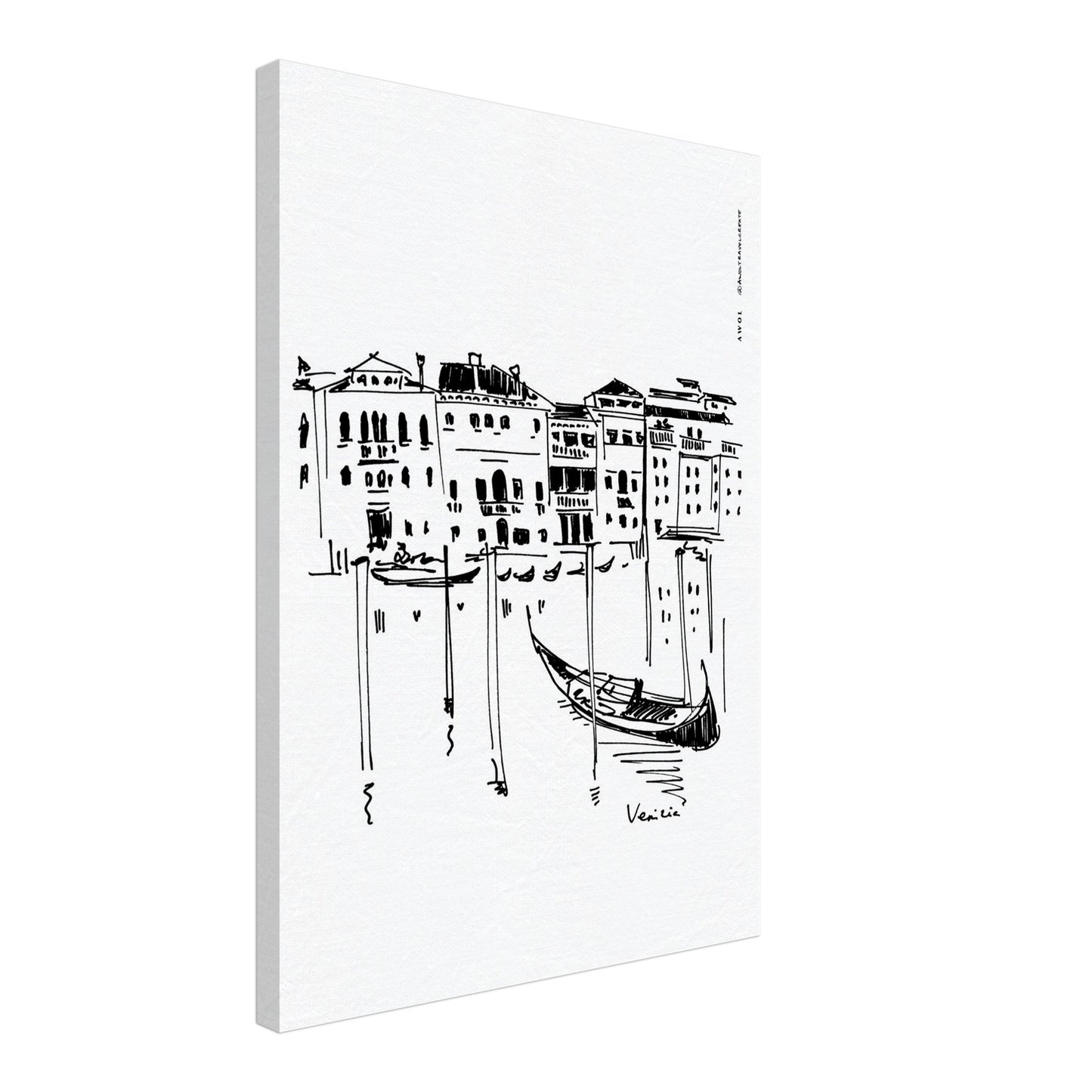This black and white Venice city canvas art print captures the romantic mood, beauty and unique mystery of this iconic Italian city on water in a contemporary aluminum travel print. A gondola sways on calm waters with reflections while across the Grand Canal, Venetian palaces and villas mix in a blend of architecture styles: Byzantine, Renaissance, Baroque and Neoclassical and Venetian Gothic palazzos. This Italy wall art print on aluminum is a hand drawing in a high contrast, graphic drawing style that depicts Venice in a modern art style, making this a contemporary and unique Italy scenery artwork for your wall decor.