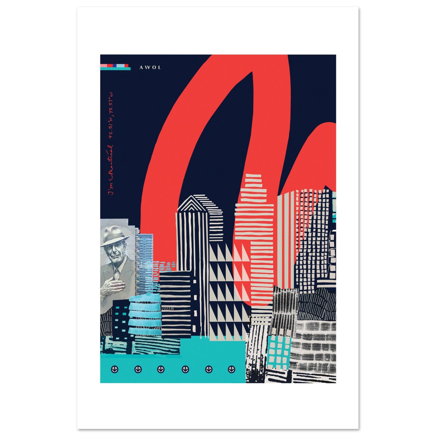 This bold, graphic Montreal city aluminum art print is a modern urban wall art decor artwork on aluminum of the skyline of Montreal, Canada - using mixed media, navy blue, turquoise blue, and a red accent colour pop, this Montreal skyline collage art depicts the famous mural of Leonard Cohen among skyscrapers and highrise buildings, paying homage to this Canadian artist and to the city's architecture. Abstract red spray paint makes a nod to the vibrant street art culture Montreal is famous for - if you've been to Mural Festival or walked around St. Laurent boulevard, you know.