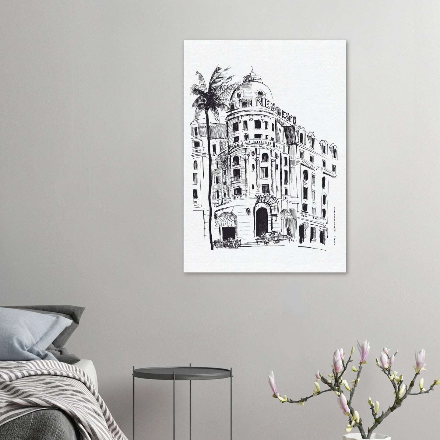 This monochrome wall art of the iconic Negresco Hotel is an elegant black and white wall canvas art of a beautiful building on the French Riviera, with tall swaying palm trees and luxurious cars. The sketchy and modern art style of this architectural drawing, with its intricate line illustration details of this landmark in Nice, France, evokes relaxation by the seaside in this beautiful vacation destination - the famous Côte d'Azur.